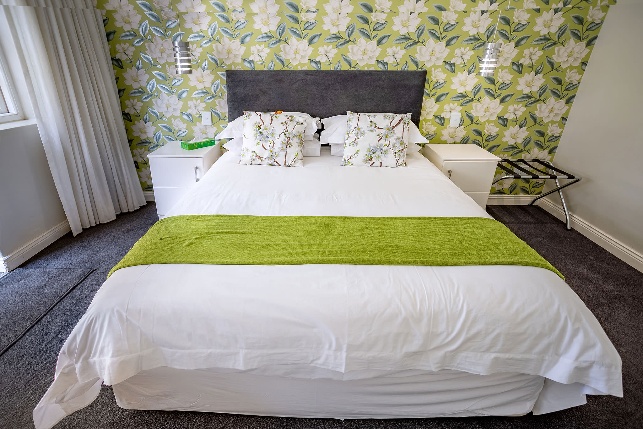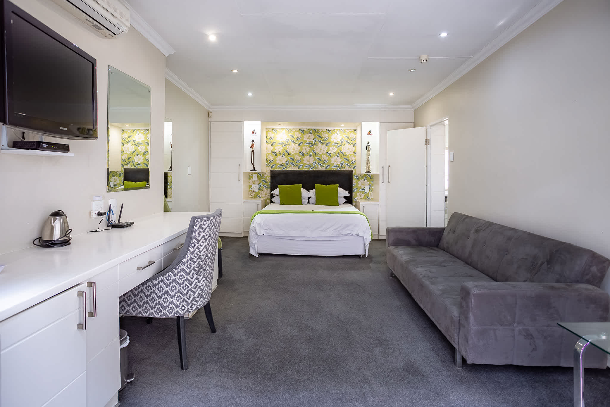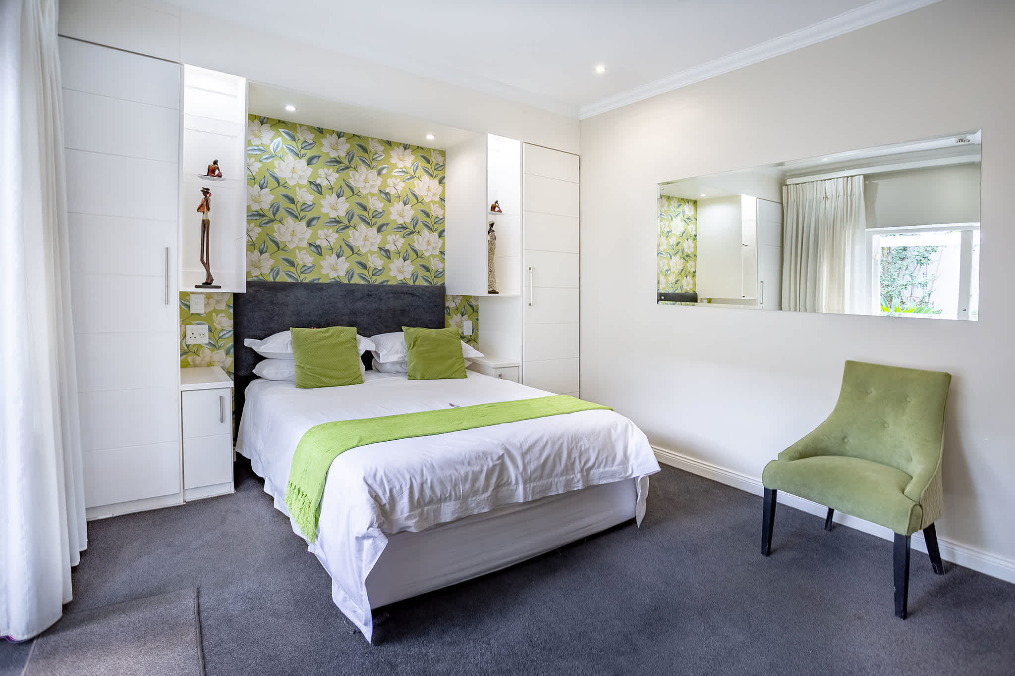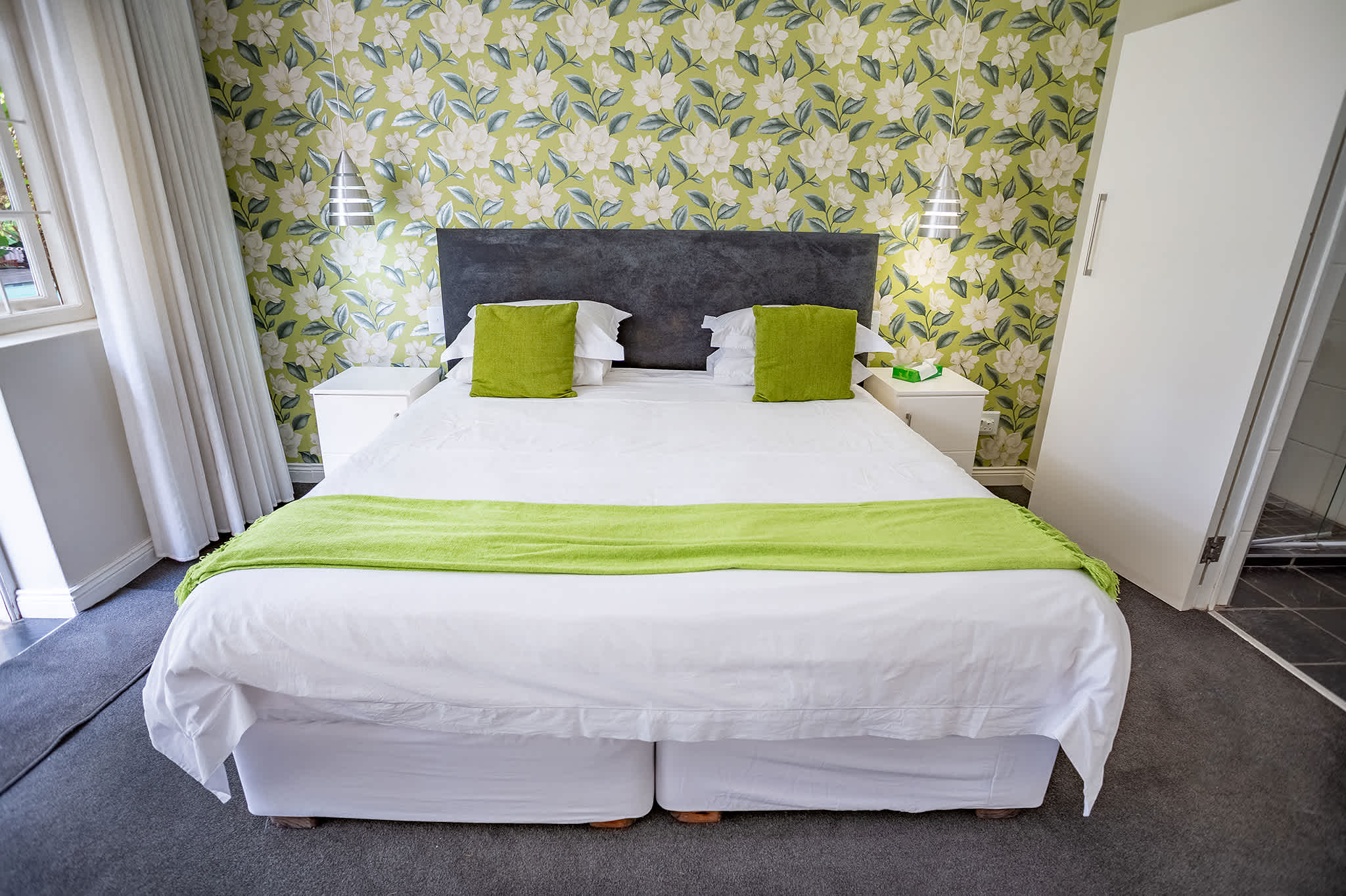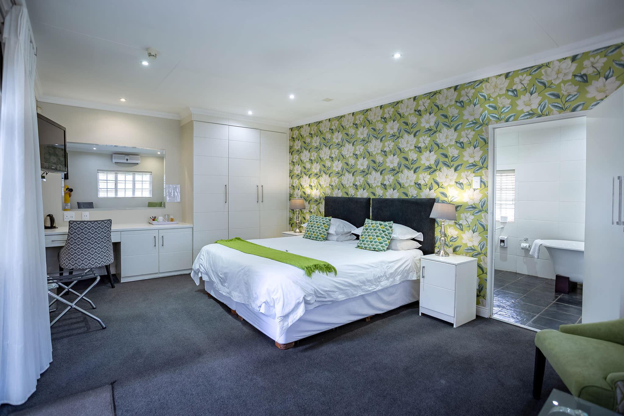 A spacious bedroom with your choice of twin or a king size bed, private seperate entrance and an en suite bathroom featuring a seperate bath and shower. This room is specially designed to be wheelchair friendly. The bathroom features a separate bath and shower and is equipped with underfloor heating. The glass panelled double wooden doors open up into the beautiful lush green landscaped garden.